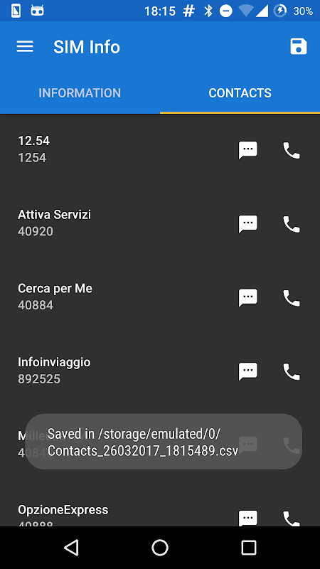 SIM Info allows you to have at hand the main information relating to your SIM and contacts present in it, which can be easily saved to a .csv file.