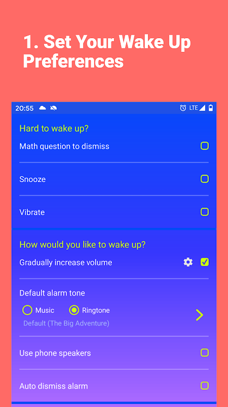 如果您在早上使用 Simple Alarm Clock 叫醒您,您將能夠以一種平和漸進的方式從夢中輕輕醒來,因為 Simple Alarm 會緩慢增加鬧鐘音量,而不是從最大音量開始。這樣,您就可以避免在熟睡時被響亮的聲音嚇到。
