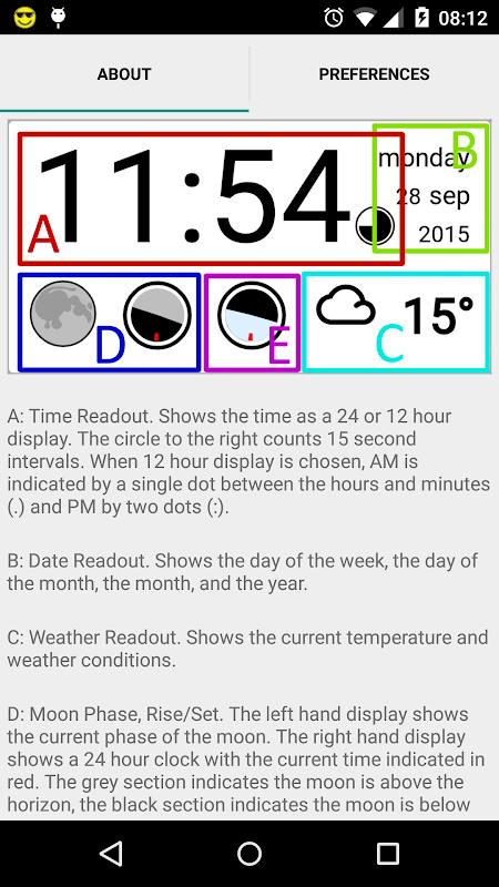 A simple clock widget that displays the current time (with quarter minute indicator), current temperature and weather conditions, the day of the week, day, month and year, the times of sunrise and sunset, the times of moonrise and moonset, and the phase of the moon.