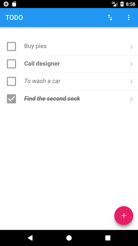 A simple list of tasks with manual sorting. No reference to date or time. No data storage in the cloud. Your task list on your device only. You can add or delete tasks, you can reorder tasks. Nothing more.