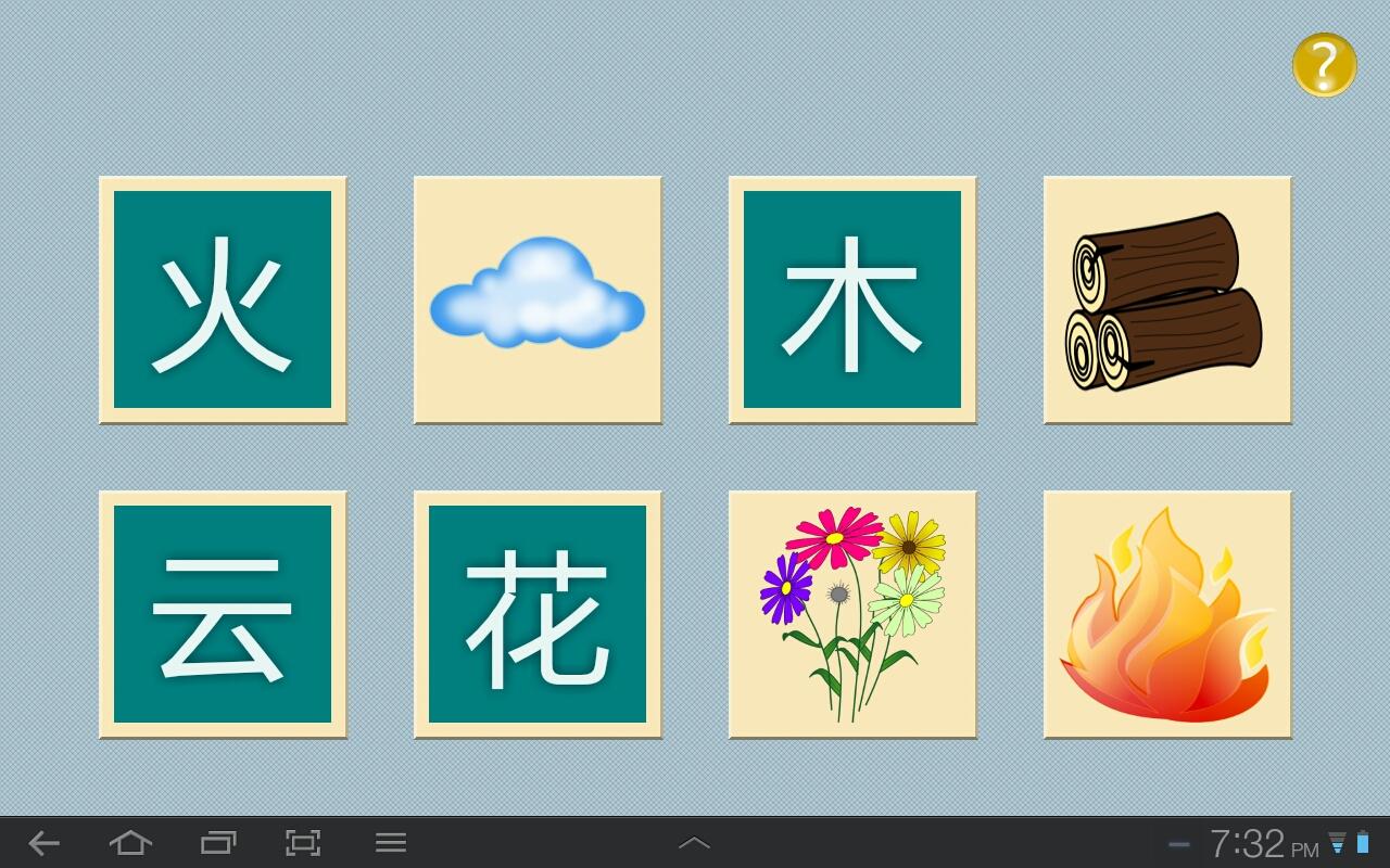- Match Game, is similar to memory games. Tap on the Chinese character with its corresponding picture, the two blocks will disappear, once the board is cleared, you will be rewarded with a delicious surprise. The blocks are not covered, so you are not memorizing the location of the blocks, rather the association of the character and its picture.