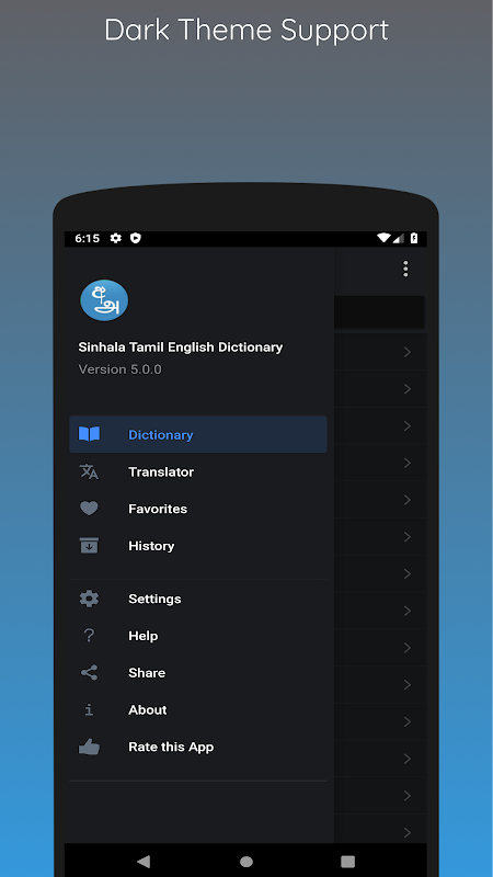 作為 Android 市場上第一款僧伽羅語-英語詞典,此應用程式還支援英語到泰米爾語、僧伽羅語到英語、泰米爾語到僧伽羅語之間的翻譯。
