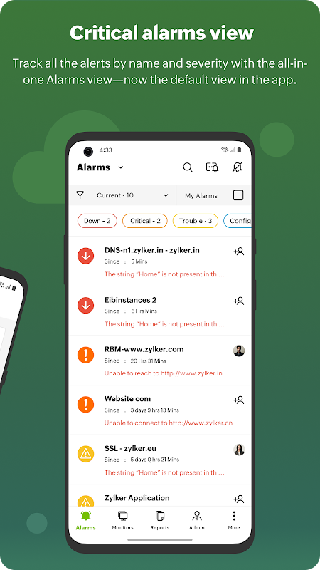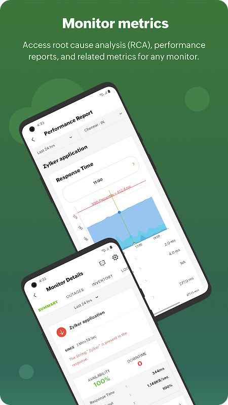 Site24x7 Android 應用程式如何提供協助 根據您的使用者設定文件,您可以接收即時通知、新增評論、分析事件的根本原因、追蹤受監控資源的 KPI、將已知警報標記為維護以及驗證補救措施 - 全部透過行動應用程式完成。 Site24x7 Android 應用程式提供所有受監控資源的可用性和效能報告,以及根本原因分析 (RCA)、服務等級協定 (SLA) 和停機時間報告。