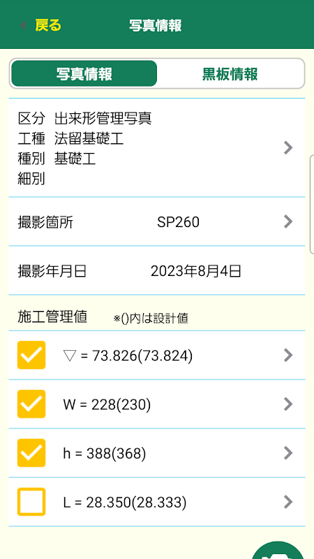 您可以輸入成品的測量值,並在現場立即檢查是否在標準值和內部標準值範圍內。另外,在拍攝成品管理照片時,可以將成品管理中輸入的工種、工位、草圖、測量值等信息作為照片信息。