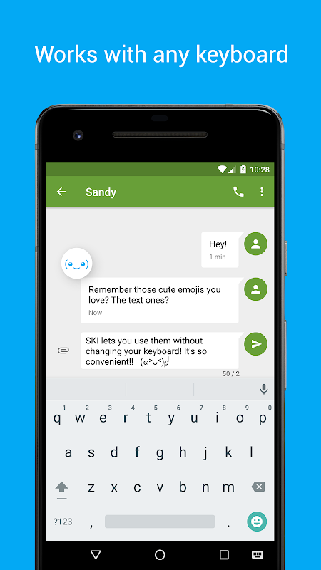 作為一個浮動的應用程序,SKI作品與你們一起使用任何鍵盤。只需輕按一個kaomoji將其粘貼到您按輸入框。