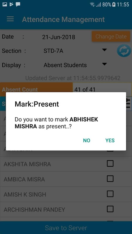 An application for the class Teachers to mark the students as absent on daily basis. This application also provides a feature to update attendance details electronically and fetch the details again from previous dates.