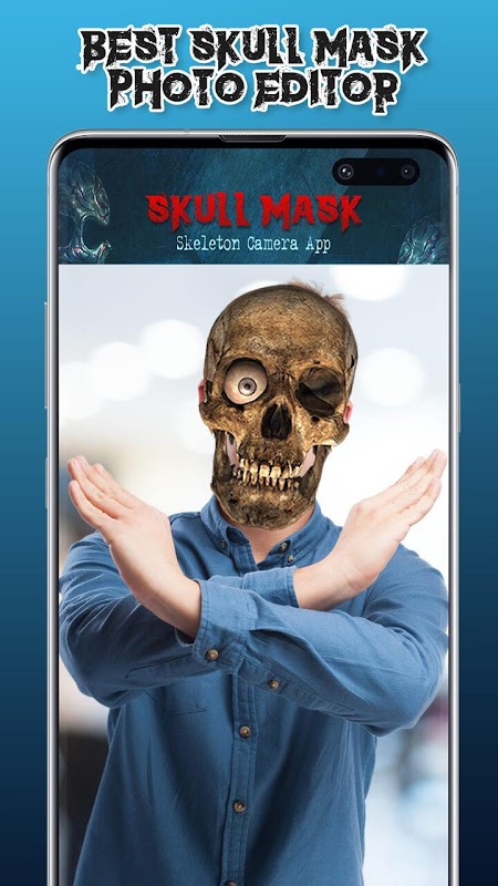 看起來像骨架頭骨面具照片編輯器 – 骨架相機。將骷髏面具放在臉上,看起來非常可怕!嘗試新的恐怖面具,並創建無數可怕的照片與頭骨貼紙圖片。打開這個可怕的照片編輯器,拍照或從照片庫上傳照片,並為照片添加可怕的貼紙。找到你最喜歡的骷髏面罩,點擊它,然後用手指移動它以適合你的照片!恐怖照片編輯器可用於向圖像添加文本,並在照片上寫下可怕的消息,使其更加可怕。你會驚訝於這個頭骨照片編輯器的結果。在頭骨圖片編輯器的幫助下製作可怕的面孔,你會看起來像恐怖電影中的角色。試試我們的頭骨相機照片編輯器,立即進行虛擬轉換。