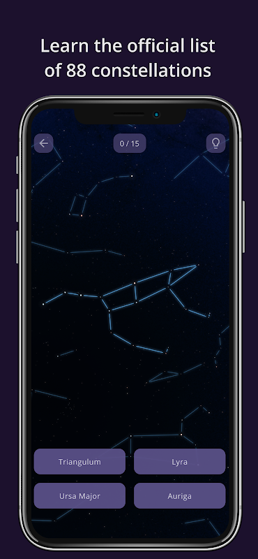 - 123 個級別教授、訓練和測試您對國際天文學聯合會定義的所有 88 個星座的知識。