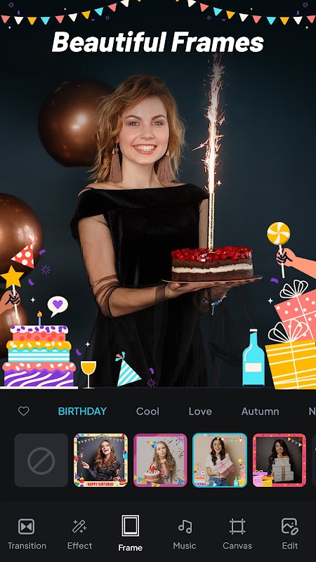 帶有音樂、相框、轉場和時尚效果的照片影片製作器