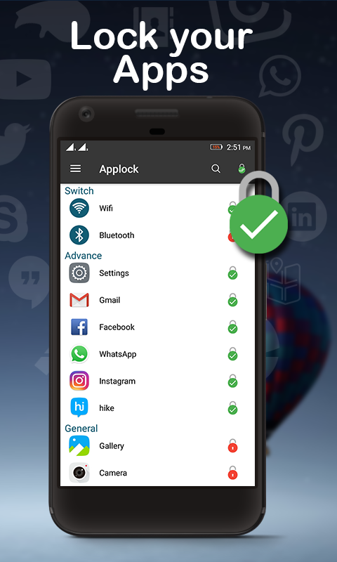 帶有PIN /密碼,解鎖圖案和隱藏跳馬保護您的隱私的應用程序。