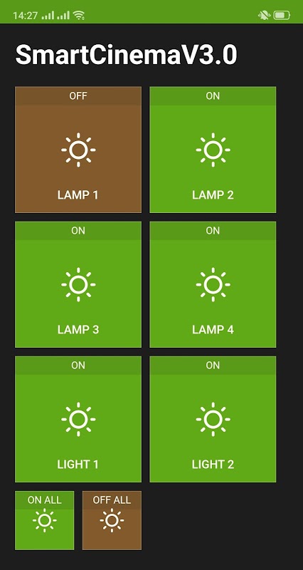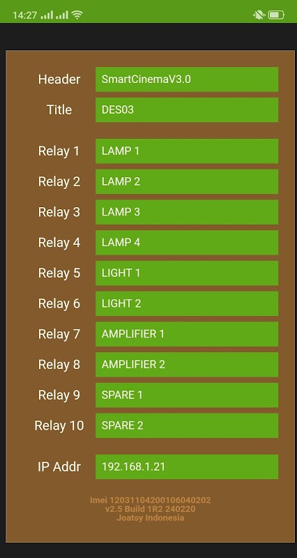 Aplikasi yang digunakan untuk mengdendalikan berbagai beban elektronik via jaringan lokal bisa berbentuk kabel ataupun wifi. Dengan tampilan yang bertema metro, style ala windows 8 dengan corak warna hijau alpukat dan coklat dengan icon khusus yang mewakili beban yang akan dipantau atau dikendalikan.