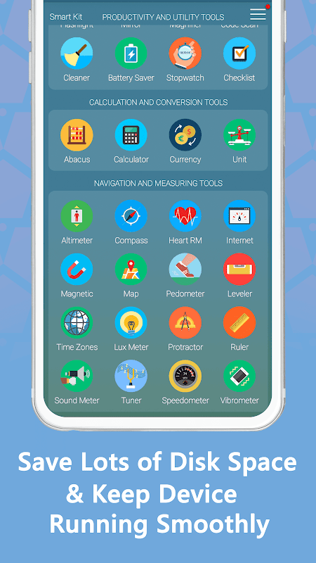 Smart Kit 360 is an all-in-one app and is half the size of a common "standalone tool" application like compass, translator or a ringtone maker app. This way you'll save a lot of disk space, time and frustration searching for all the daily essentials you need!