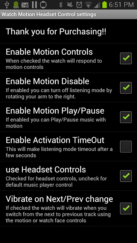 SmartWatch Motion Headset Ctrl gives you the freedom to control your media completely hands free!! Move to the next track with a twist of the wrist. Play and pause your music with a simple gesture! If you have ever wanted to control your music from across the room without having to touch anything then this is the app for you!