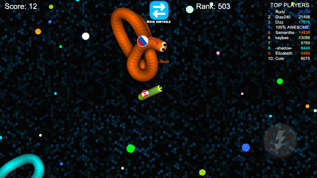 - Slide ahead of other snakes to kill them and eventually eat their light dots.