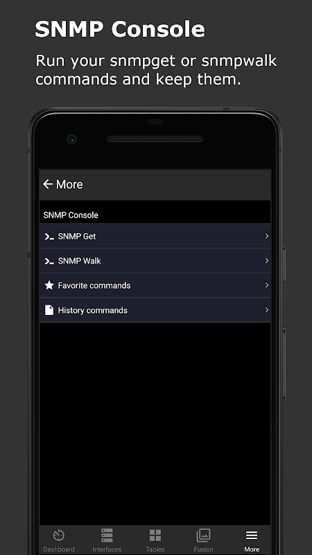 •SNMP控制台。手動snmpget提交表單。手動snmpwalk提交表單。保存您喜歡的命令並稍後運行。查找歷史記錄命令(如果需要)。