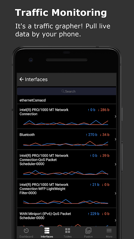 •交通監控。統計界麵類型,顯示網格和餅圖。實時界面速率列表,顯示最後的發射/接收和迷你折線圖。提取間隔為3秒。實時界面詳細信息視圖,顯示tx / rx最後,最大,平均值和大折線圖。