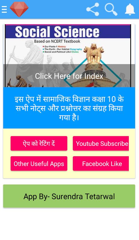 該應用程序包含第10類的NCERT社會科學所有章節的解決方案。它還包含一些示例性問題論文以及各章明智的問題答案。這個程序有一個非常簡單的用戶界面。