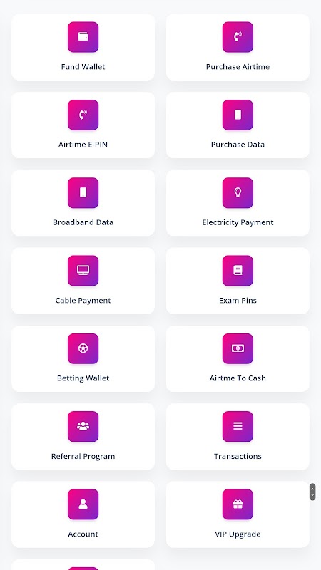 :Softhubdata 應用程式是一個行動虛擬充值平台,提供快速充值解決方案,方便支付有線電視、電費、考試密碼(JAMB、WAEC、NECO 和 NABTEB)、投注網站(例如Sportybet、Bet9ja、Nairabet、1Xbet 等)、所有網路的儲值針列印、資料卡列印、寬頻訂閱(例如SMILE、Spectranet)。 Softhubdata 將世界帶給您