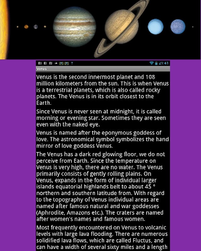 Are you interested in astronomy? Learn about our solar system and its nine planets. This app contents detailed descriptions about the sun and the planets of our solar system. You can view colored images in the Outerspace Gallery and you can hear the saturn sound in the background. Thereby you can impress your friends and your family with your astronomic knowledges. Language: English.