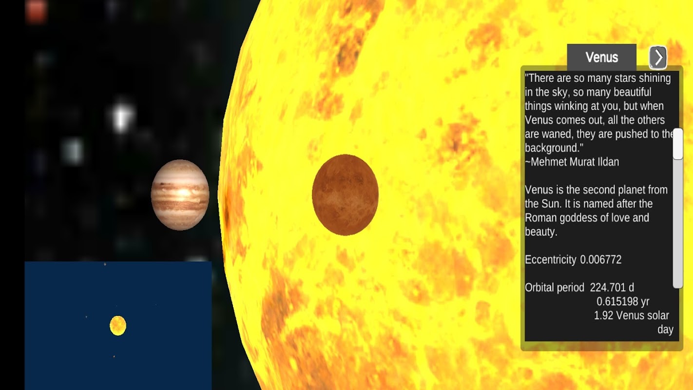 我們生活在這個太陽系中。我們必須了解我們的太陽系。這是一個簡單的應用程序,可以簡單地可視化我們的太陽系。對於想要了解我們的太陽系的孩子來說,此應用程序可能非常有用。由於這不是科學論文,因此無法保留確切的信息。可以單獨查看9個行星。要返回主視圖,請單擊太陽左下方。要單獨查看,請單擊名稱按鈕。左下方的屏幕是頂部的模擬視圖。