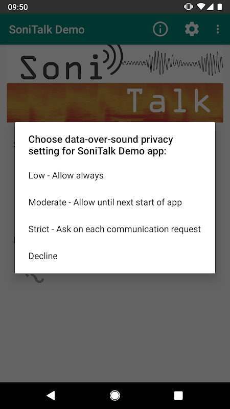 SoniTalk是一種新穎的開放式透明協議,用於智能手機,電視和物聯網設備等設備之間的超聲波通信。因此,SoniTalk通過細粒度的權限系統為用戶提供對其隱私的完全控制。