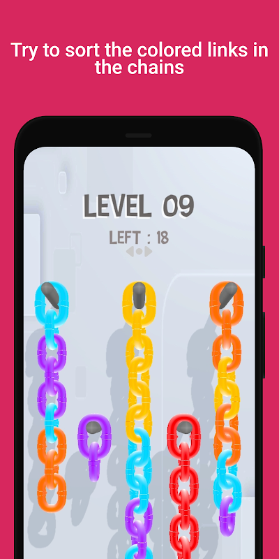 Sort Chain Color Link: Puzzle 3D Game - This is a fun and addictive puzzle game. Try to sort the colored links in the chains until all the colors are in the same chain. A very challenging but relaxing game. Train your brain every day. Be a genius and defeat everyone.
