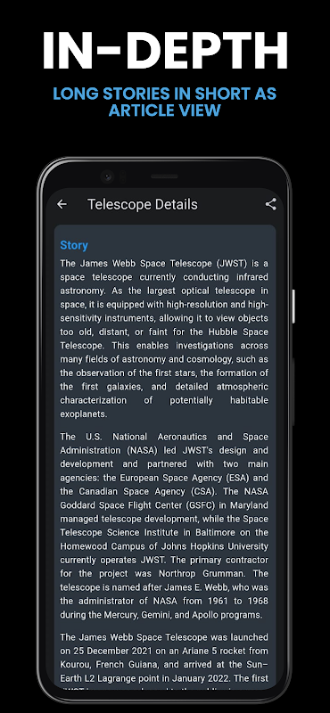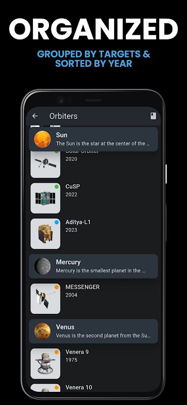 我們的應用程序包含所有漫遊者、軌道飛行器、飛行器和太空望遠鏡的完整列表,為您提供有關每項任務的所有詳細信息,包括發射日期、目的地和目標。您還可以欣賞每個太空任務的短篇故事和亮點,讓您更深入地了解正在進行的科學發現。