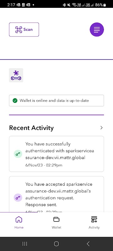 3. 將您的 Spark 工作許可證錢包連結到您的 Spark 數位授權帳戶。 Once you register your email and password you will be directed to a screen to Link your Spark Work Permit Wallet to your Spark Digital Permitting Portal Account.在智慧型手機上開啟 Spark 工作許可證錢包並選擇掃描。將 QR 掃描器懸停在用戶註冊入口網站畫面上顯示的 QR 碼上幾秒鐘。錢包將自動連結錢包,您將在您的入口網站帳戶上看到錢包 ID 顯示為 DID(去中心化識別碼)。