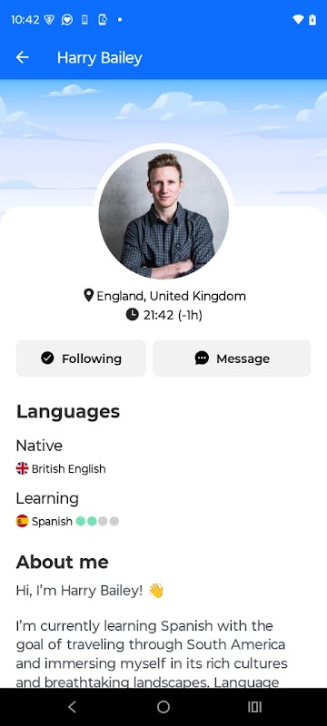 無論你想提升英語、西班牙語、德語或其他任何語言水平,我們的應用程式都會根據你的目標、興趣和熟練程度為你配對學習夥伴。