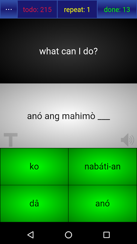 The app allows users to learn each sentence through trial and error. They are shown an English translation and tasked to build the corresponding Ilonggo phrase word by word. If they make a mistake, the phrase is automatically put in a "repeat" pile, and they will be given another chance sometime later to try again until they get it right.