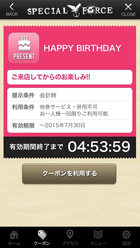 ●那些生日券以上被傳遞到出生日月,將不會在應用安裝時發出。 (為了接收優惠券,任何生日輸入需要在用戶側)