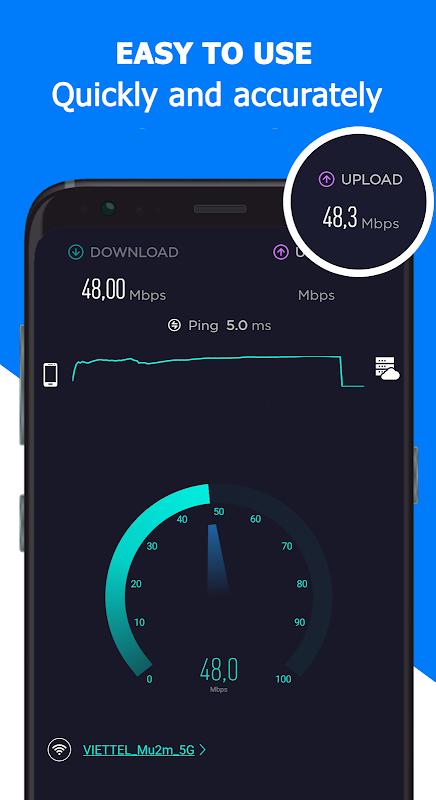 Speedtest our is a free internet speed meter. It can test speed for 2G, 3G, 4G, 5G, DSL, and ADSL. It's also a wifi analyzer that could help you test wifi connection.