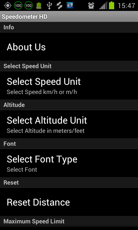 Speedometer displays your current speed on a digital/analog speedometer, keeps track of your top speed and average speed. It also allows you to easily switch between units of measurement (miles/hour or km/hour) for use in your vehicle (your cycle, your car, on a boat or on an airplane)