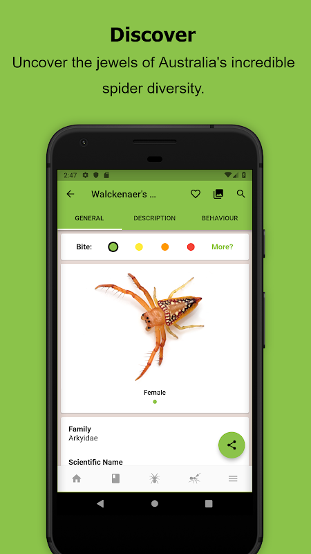 有經驗的用戶可以按類別(包括棲息地和家庭)瀏覽我們的實地指南。而是搜索以立即將您帶到應用程序中的任何物種、查找詞彙表或查找密切相關的物種。補充內容解釋了蜘蛛的解剖結構、消除了誤解、回答了常見問題等。