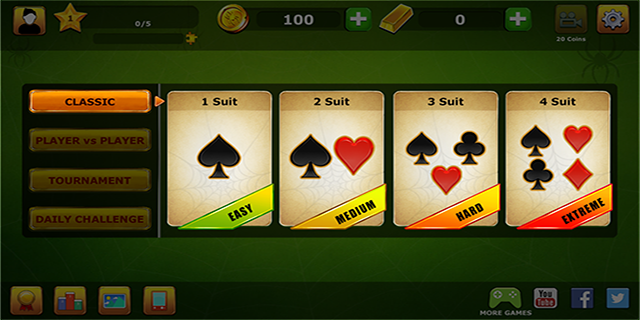 4 Spider Difficulty Levels - 1 Suit, 2 Suit, 3 Suit, and 4 Suit
