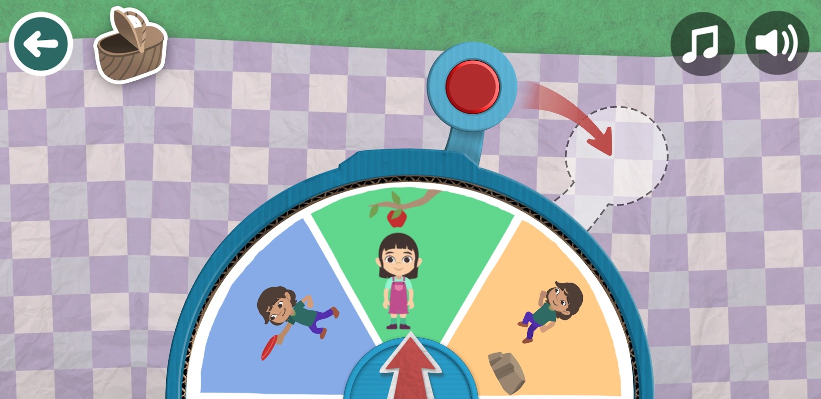 旋轉輪子以從四組主題活動中進行選擇(像食物一樣運動,像動物一樣運動,在公園玩耍或去野餐)。