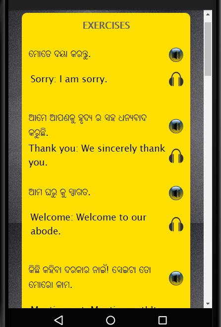 ***** This app is useful in giving you the knowledge of English Basics before you start learning Business English. After completing this tutorial, you will be able to figure out common mistakes In English. Often people jump start with Grammar and Parts of Speech, but it is suggested that you first learn with this Oriya to English Phrasebook. Learn to Speak English by Play & Learn method. You can Learn Languages free using the techniques specified in this learn english magazine. This app gives you a basic BPO Interview Briefing. Use this speaking english book free and make full use of this speaking english course app. Your next step could also be a group discussion app for interview or an app on English for competitive exams - it will completely your choice. Comprehending English verbs through English listening can also be your future course of action. Here you can also learn to some extend, English for BPO. Learn English by Listening and find here Interview Questions and Answers. You will also be able to Learn English Words or Learn English Vocabulary Daily. This can be your first step towards learning English for Bank Exam. Later, you can refer an Idioms and Phrases Dictionary and strengthen your English. If you are wondering as to how to speak english fluently in 30 days, this can be your perfect destination. We suggest that after you have completed perusing through your app content, you can memorize Synonyms and Antonyms or chisel your English for Banking & SSC preparation. Remember that this is a Odia to English Speaking app.
