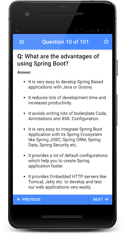 Spring Boot Interview Questions and Answers是一個簡單的Android應用程序,它以直觀的方式列出了100多個最常見的Spring Boot面試問題和Answers。