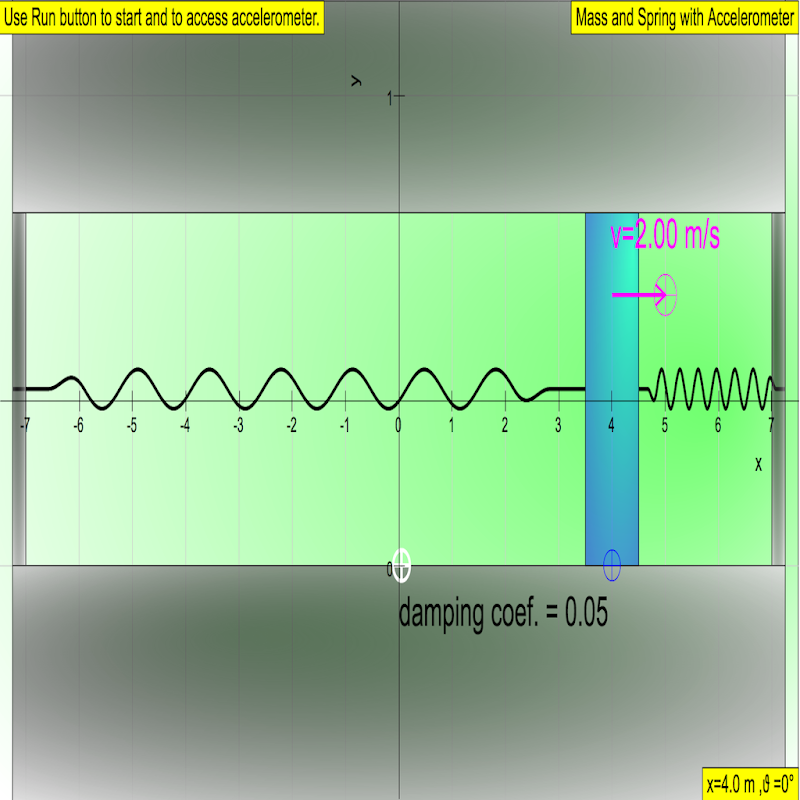 The Horizontal Mass and Spring Harmonic Oscillator mobile JavaScript model illustrates the forces and dynamics of a simple oscillator. This simulation uses the accelerometer on your mobile device to read the direction of the gravitation field g. You may need to lock the orientation of your screen to maintain a fixed view as you tilt your device. For use on computers without an accelerometer or for classroom use, the "No sensor" mode simulates a tilted device in the view. See also the Vertical Mass and Spring mobile JavaScript model.