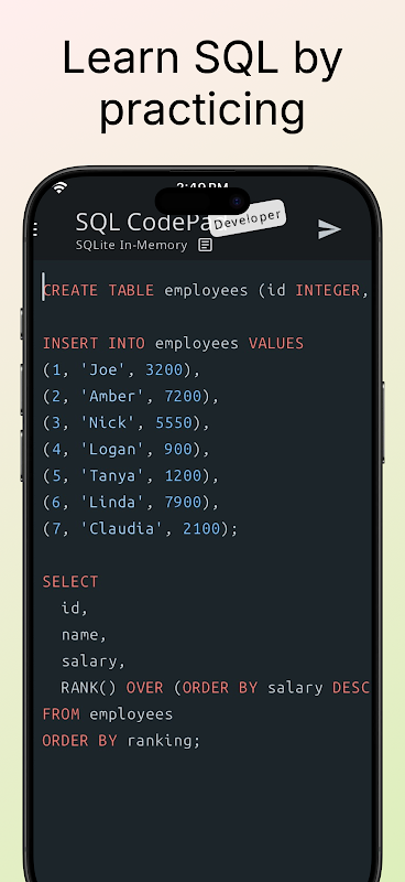 SQL CodePad 是終極 SQL 編輯器和資料庫用戶端,適合任何想要學習、練習和掌握 SQL 的人。無論您是初學者、學生、開發人員、資料分析師或資料科學家,SQL CodePad 都將協助您在行動裝置上釋放 SQL 的強大功能。