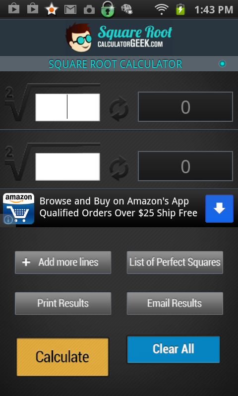 平方根計算器 - 計算散裝 - 電子郵件或打印結果