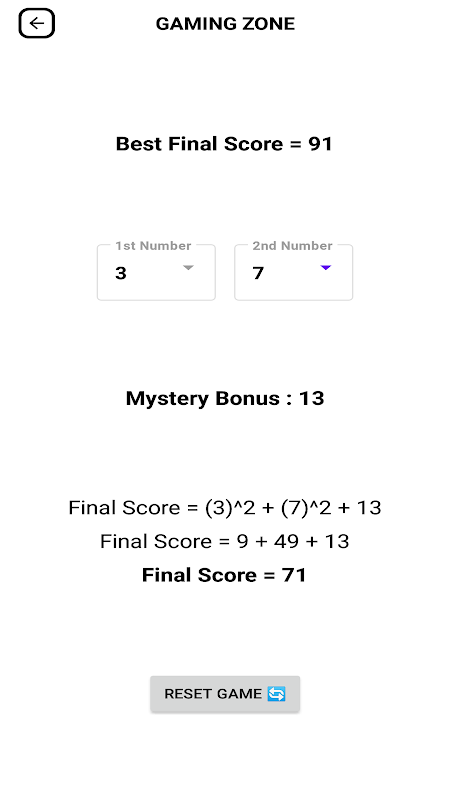 一個很酷的數字遊戲,您可以在 1 到 10 之間選擇兩個數字,最終得分是兩個數字的平方和。可是等等!有一個轉折,一個隨機的神秘數字也被添加到最終分數中。玩,看看你能把你的最終分數提高到多少!