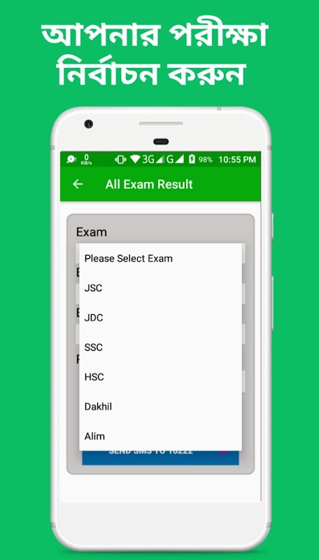 ২. এমএমএস এর মাধ্যমেঃ- সেজন্য অ্যাপসের SMS অপশানে যেয়ে রোল নাম্বার, সাল ইত্যাদি পূরণ করে সেন্ড করলে ফিরতি SMS এ রেজাল্ট পাওয়া যাবে।