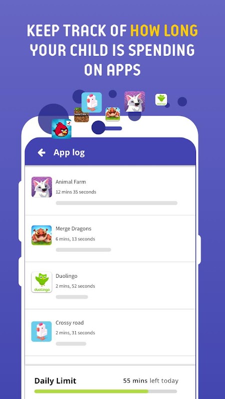 Screen Time for Kids 與Screen Time Parental Control App 配合使用在您孩子的設備上。