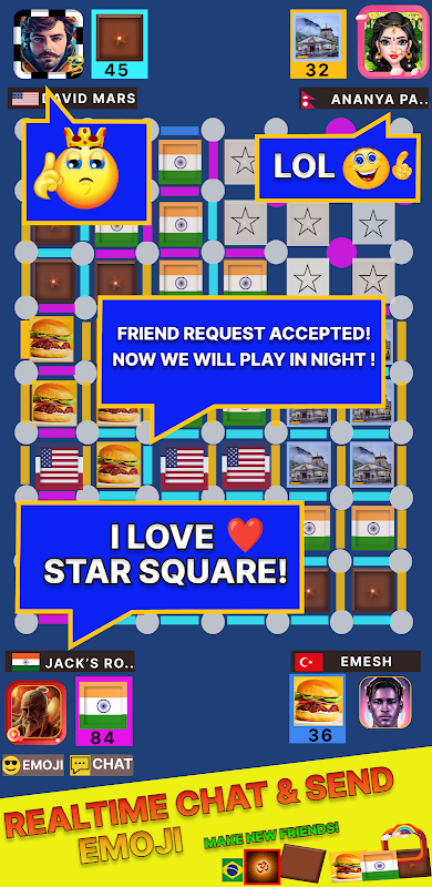 與線上真實玩家一起玩星廣場,這是一款新的棋盤遊戲。這基本上是 DOT (🔵) 連接方塊製作遊戲。即時聊天🗨️/神奇的表情符號😍/即時談話📞/這款棋盤遊戲上的即時多人遊戲(超過 1 名玩家,就像 ludo、Carrom )。這是最好的盧多另類遊戲。