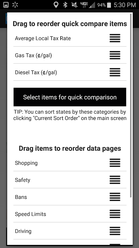 +自定義排序:您可以按字母順序排序的狀態列表,按距離,並通過你選擇的快速比較的字段。如果你曾經想看到什麼狀態具有最低酒精或燃油稅,這項功能可以很容易!
