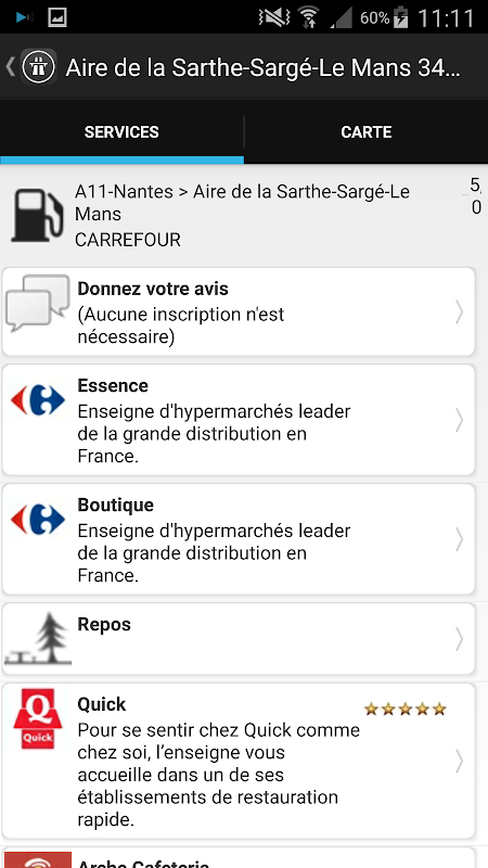 Stationaute可以幫助您選擇高速公路或高速公路上的最佳服務區或休息區。超快速且易於使用,您可以啟動該應用程序,並且由於有了GPS,該應用程序可以確定路線上的站點。