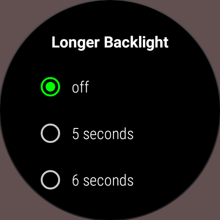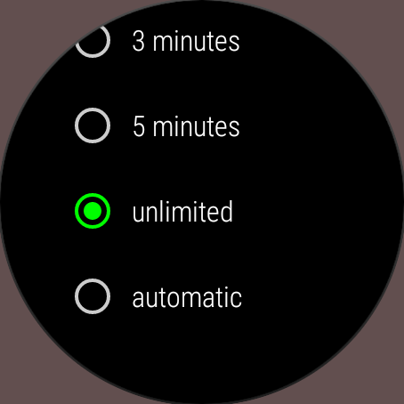 StayLit Wear 讓您可以根據需要讓燈保持打開狀態 - 也可以超過 30 秒:1 分鐘、2 分鐘、3 分鐘、5 分鐘或無限制,直到您關閉顯示屏。 StayLit 提供了 5 秒到 30 秒之間的細粒度刻度。