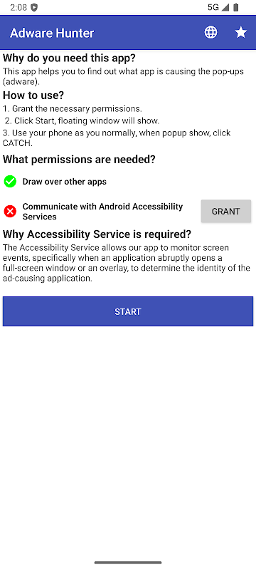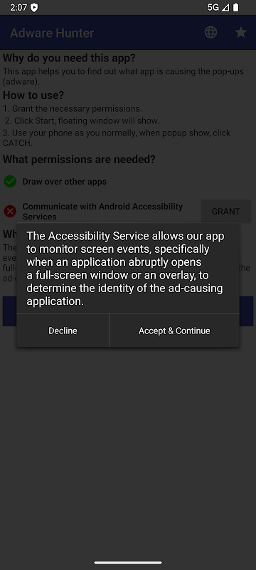 Adware Hunter 需要輔助功能服務權限才能提供其核心功能:分析並即時識別螢幕上突然出現的彈出廣告(廣告軟體)。