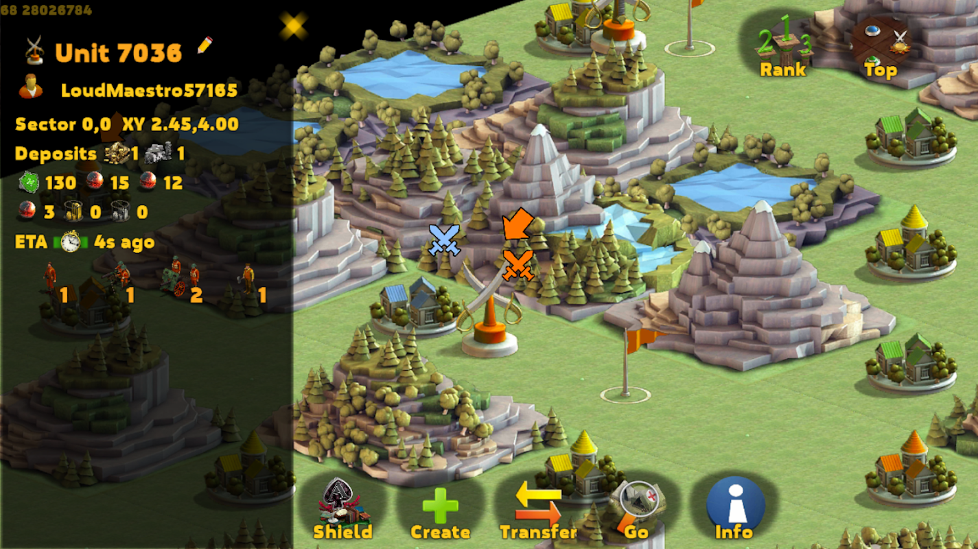 Different amounts of gold and silver deposits are distributed on land tiles. Mine resource rich tiles, and block enemy players. There are three types of Bases that Player can build. Each type has its own function. Player can have 10 Bases. There are two types of Units on the Sector map. Each unit has a level from 1 to 10. Player can have 10 Units.